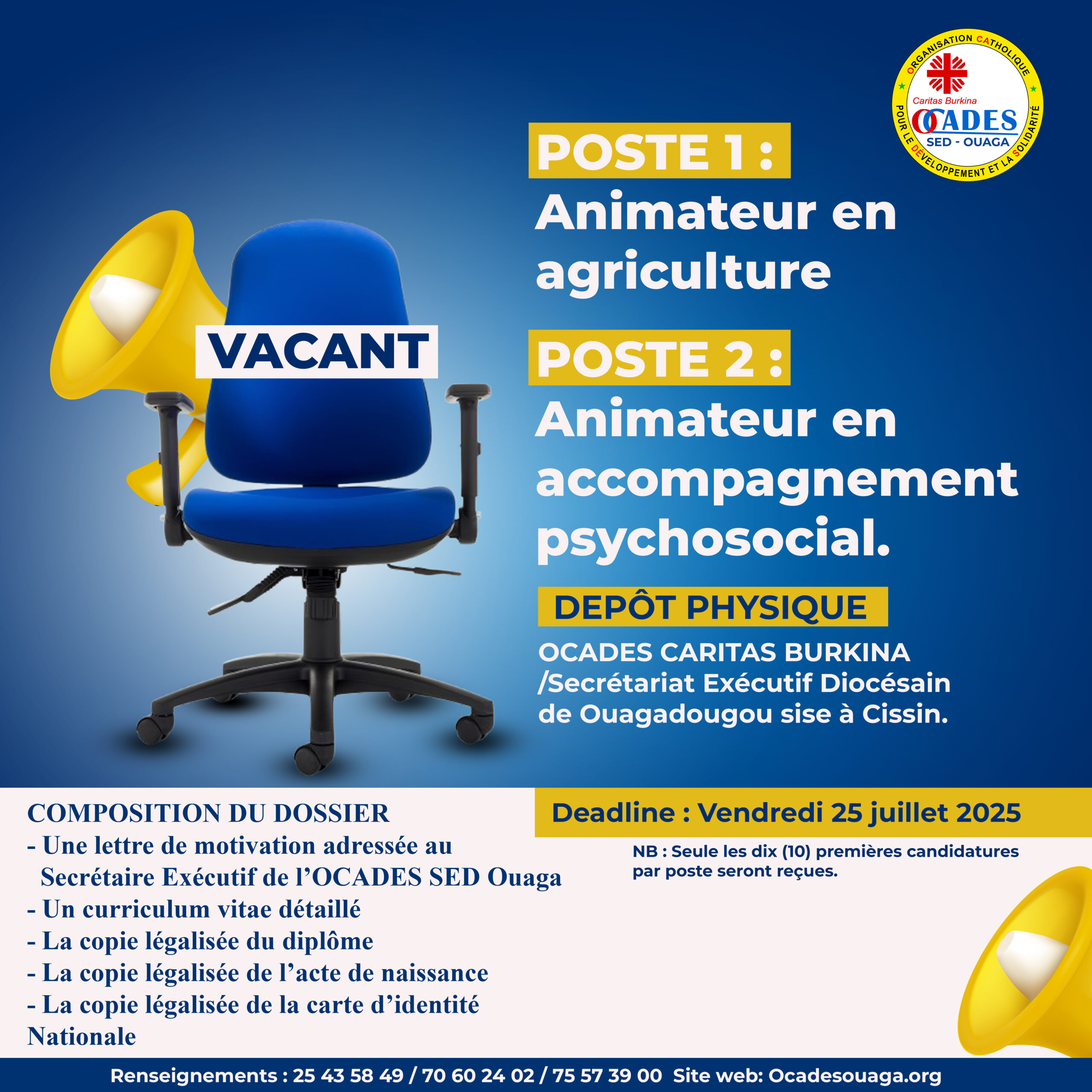 Les candidats devront faire parvenir leur dossier au plus tard le Vendredi 25 juillet 2025 à 12h00 à l’OCADES CARITAS BURKINA /Secrétariat Exécutif Diocésain de Ouagadougou sise à Cissin. Seule les dix (10) premières candidatures par poste seront reçues.